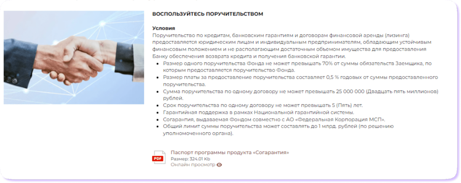 По каждому пункту нужно уточнять, какие существуют требования и условия. К примеру, условия для поручительства за МСП выглядят так:
