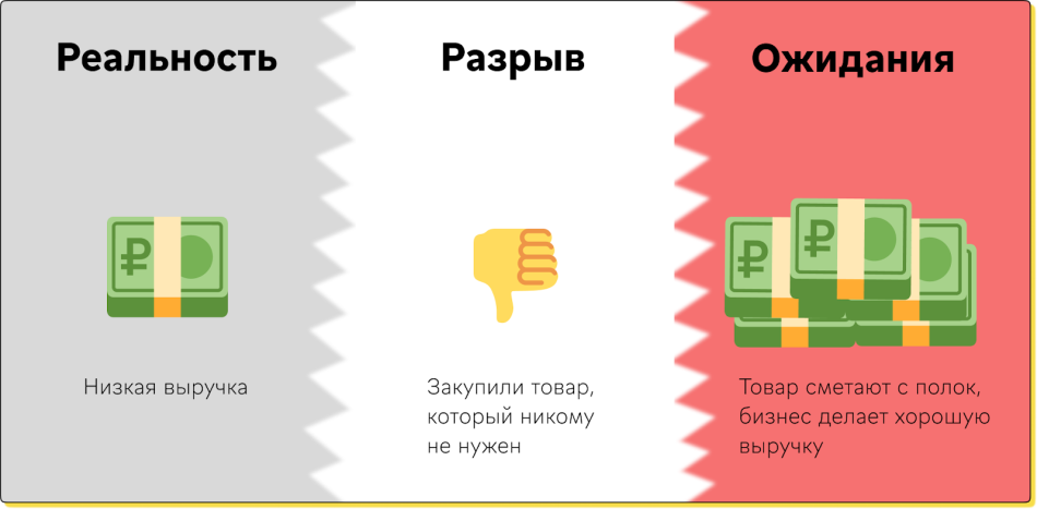 ↑ GAP-анализ помогает разобраться, почему ожидания и реальность не совпали. Метод поможет найти разрыв, который помешал получить ожидаемый результат