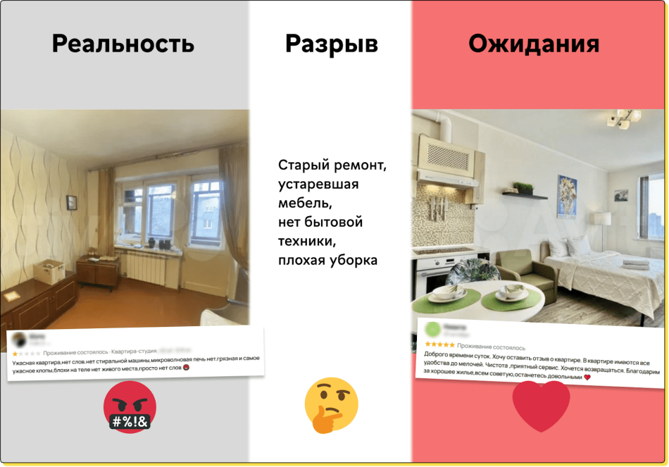 Этап 2. Оценить текущее состояние. Ремонт в квартире устарел — его делали 10 лет назад. Обои отваливаются, освещение плохое, мебель износилась, а бытовой техники нет. При этом горничная плохо делает уборку — в квартире неприятно находиться из-за пыли и запахов. Из-за всего этого бизнес получает гневные отзывы от клиентов.