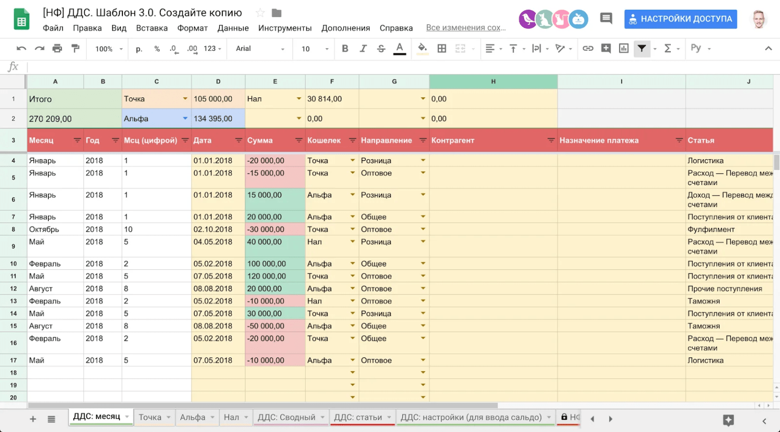 Вот так выглядит отчет о движении денежных средств в Гугл таблицах, шаблон которого можно взять из нашей барсетки.