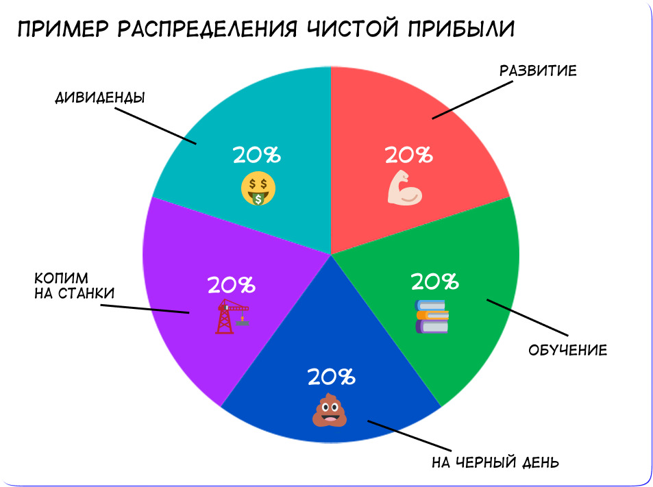 Шаг 2. Разобраться с дивидендами. За роль гендира собственник получает зарплату, а вот за роль собственника — дивиденды. Хорошо, если они будут в виде фиксированного процента от прибыли — это дает ощущение предсказуемости и стабильности. В целом процент и периодичность выплат могут быть любыми, например 30% чистой прибыли каждые три месяца или 20% каждую неделю. Главное — не нарушить свои же правила.