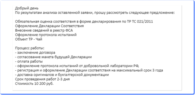 Услуги по получению необходимых документов придется оплатить отдельно. Для этого нужно выбрать организацию, которая выдаст нужную лицензию. Во время работы над этой статьей, в качестве эксперимента мы подали заявку на сертификацию чая для экспорта. Вот какой ответ мы получили: сертификат соответствия выдадут через 3 дня, нужно заплатить 10 200 рублей.