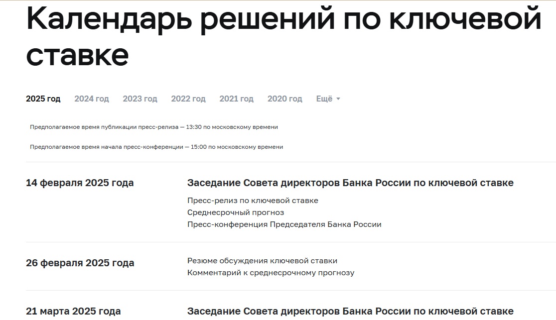 Совет директоров Банка России решает, какой будет ключевая ставка, на запланированных заседаниях, даты которых указаны в специальном календаре.