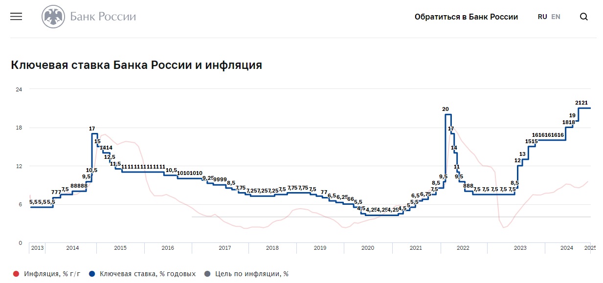 ↑ На сайте Центробанка можно ознакомиться с ключевой ставкой и инфляцией, указав нужный период.