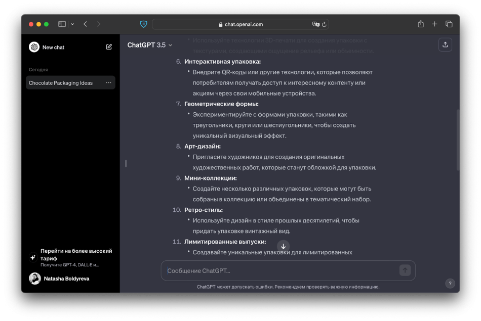 Джипити предложил идеи для упаковки шоколада: сделать QR-код с интересной информацией, выпустить лимитированную коллекцию или использовать ретростиль.