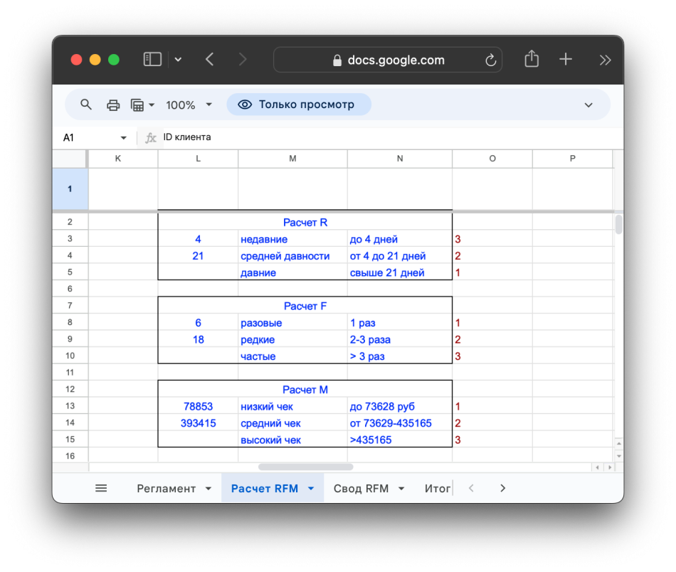 M — сумма покупок. Например, у нас низкий чек — до 73 628 ₽, средний чек — от 73 629 до 435 165 ₽, а высокий — больше 435 165 ₽.