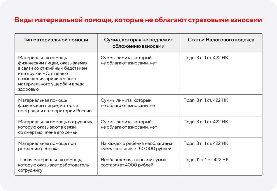 Матпомощь в размере до 4 тысяч рублей в год и помощь в связи со смертью члена семьи не облагают налогами и страховыми взносами. При рождении ребёнка необлагаемая сумма — 50 тысяч рублей, но есть нюанс: деньги должны быть выплачены в течение года с момента рождения. Подробную информацию о страховых взносах смотрите в таблице↓