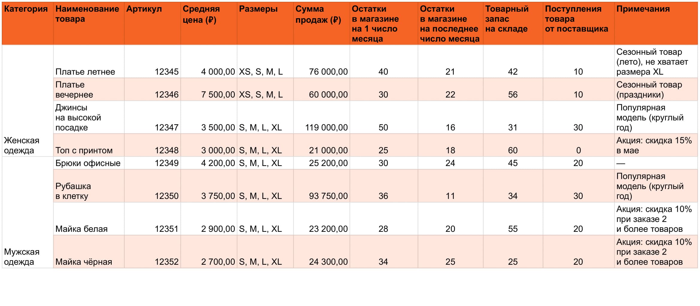 А после запуска бизнеса можно уже добавить конкретику по продажам и запасам: