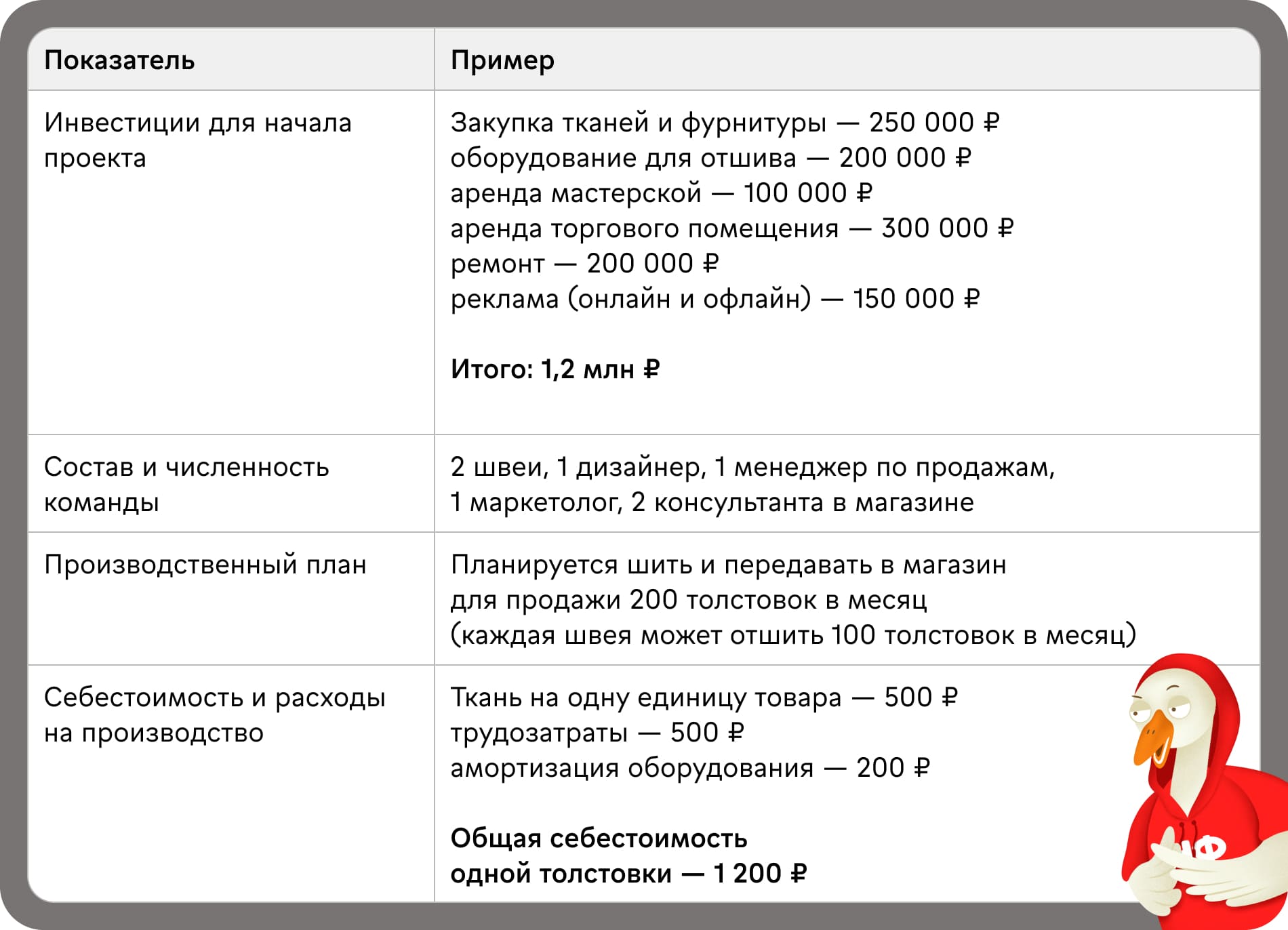 Смотрите пример расчёта для бизнеса по пошиву толстовок и их продаже ↓