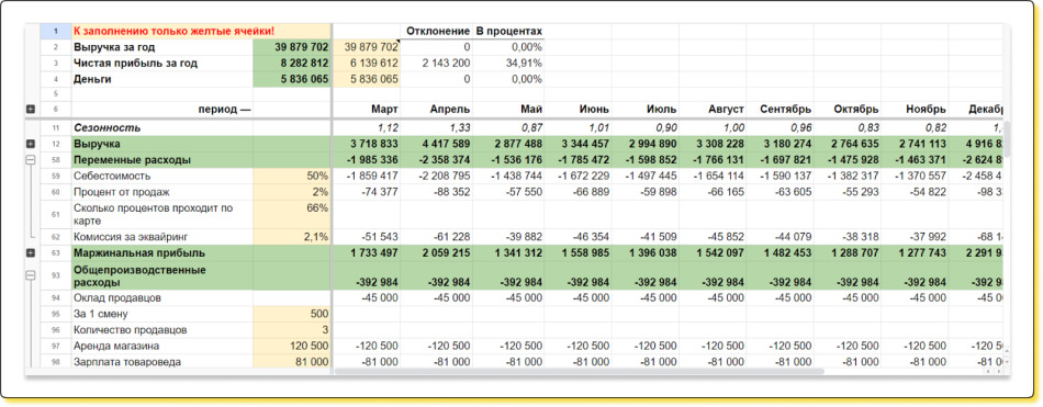Кроме отчётов и учёта запасов, вам также понадобится финансовая модель. Напомним, на старте мы советовали составить инвестиционную модель, чтобы понять, оправдаются ли вложения. А когда бизнес уже работает, вам понадобится стандартная финмодель, чтобы отслеживать все важные показатели. Данные для модели можно как раз взять из отчётов, о которых говорили выше.