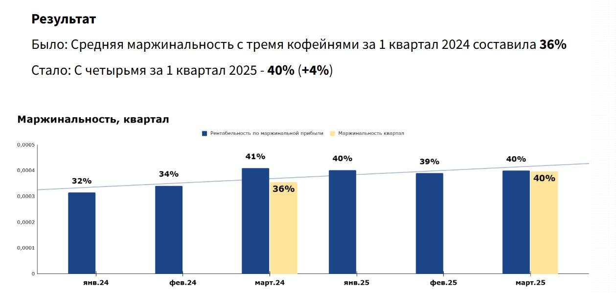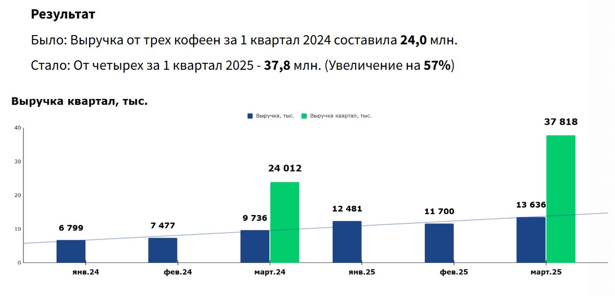 Именно эти результаты убедили инвестора в эффективности выбранной стратегии и создали фундамент для следующего шага — уверенного масштабирования до 5 кофеен.