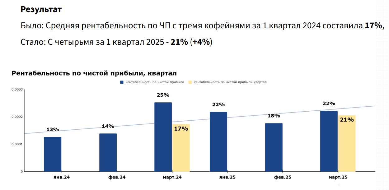 Чистая прибыль выросла на 79% после открытия 4-й кофейни, доказав эффект синергии.
