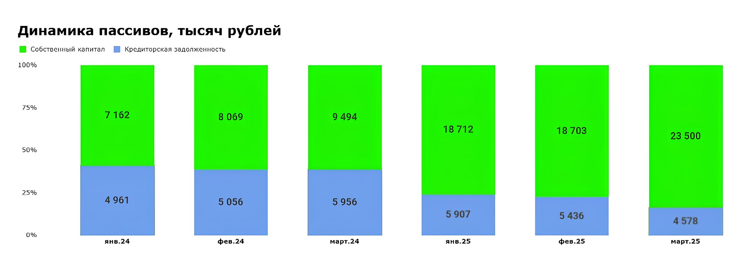 Собственный капитал вырос с 9,5 до 23,5 млн рублей, а его доля в пассивах — с 61% до 84%, что свидетельствует о высокой финансовой устойчивости.