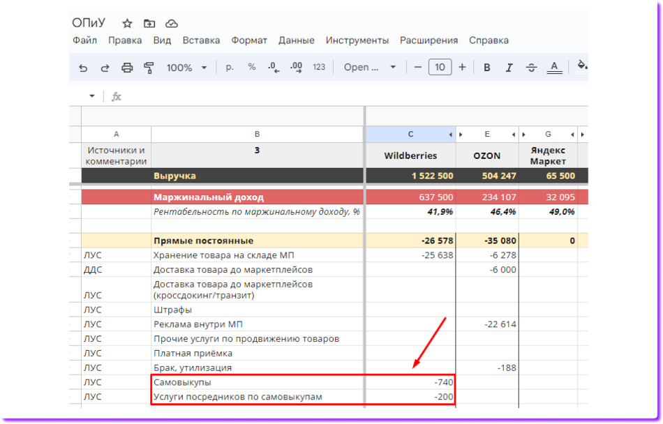 В ОПиУ также две строки: самовыкупы и услуги посредников по самовыкупам. Строка с самовыкупами включает все расходы селлера на самовыкупы через посредника, а именно: