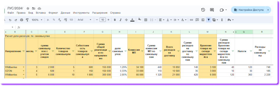 Первый вариант — определять долю самовыкупов от общей выручки. Для этого мы берем общую выручку за месяц, рассчитываем долю самовыкупов и затем распределяем расходы пропорционально этой доле.