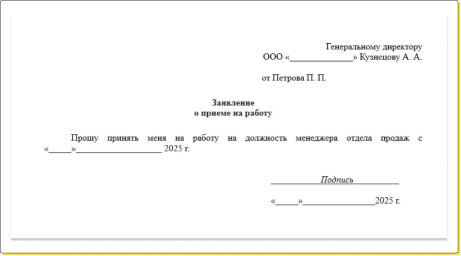 ↑ Пример шаблона заявления о приеме на работу