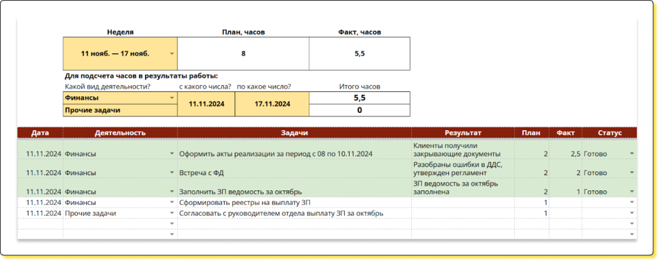 Отчет о нагрузке. Это обычная Гугл-таблица, в которой сотрудник фиксирует, над чем работал, сколько времени потратил на каждую задачу и какие результаты получил. Например, вот как выглядит отчет о нагрузке, который используют финдиры Нескучных ↓