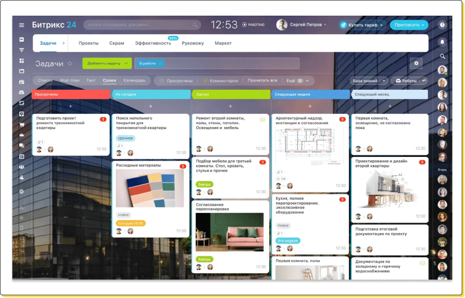↑ В Битрикс24 можно ставить задачи сотрудникам и контролировать их выполнение — например, через канбан-доску, скрам или диаграмму Ганта
