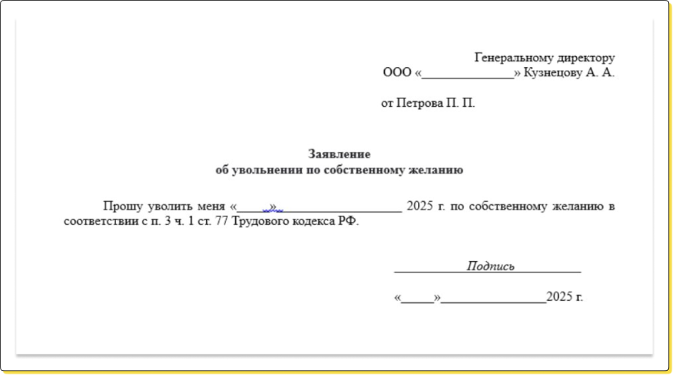 Заявление об увольнении по собственному желанию может выглядеть так ↓