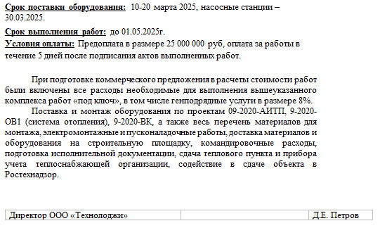 КП (или оффер) является первым официальным документом, который получает клиент при взаимодействия с компанией. Содержит конкретные предложения и условия сотрудничества.