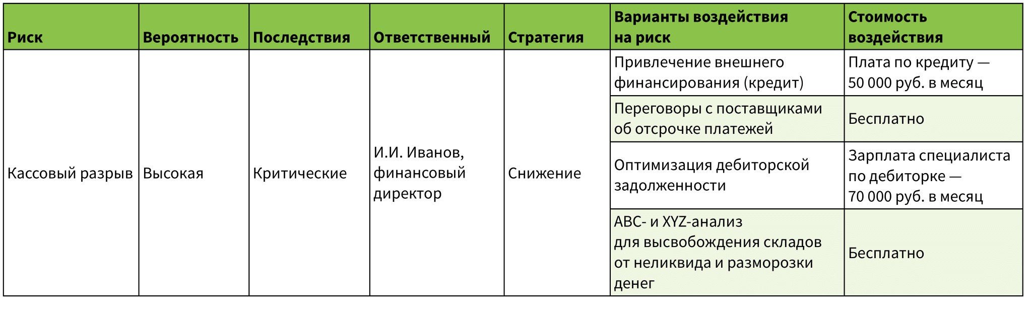 стоимость воздействия. Риски всегда связаны с затратами. Подумайте заранее, сколько могут стоить меры по минимизации или устранению рисков.