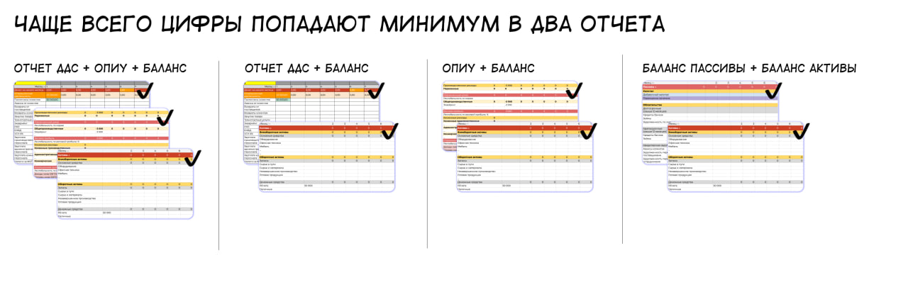 Есть еще один принцип, который помогает проверять точность отчетов: каждая операция чаще всего попадает минимум в два отчета. Например, в баланс и ОПиУ, в баланс и ДДС, или сразу в три отчета — баланс, ОПиУ и ДДС, или в два раздела баланса: