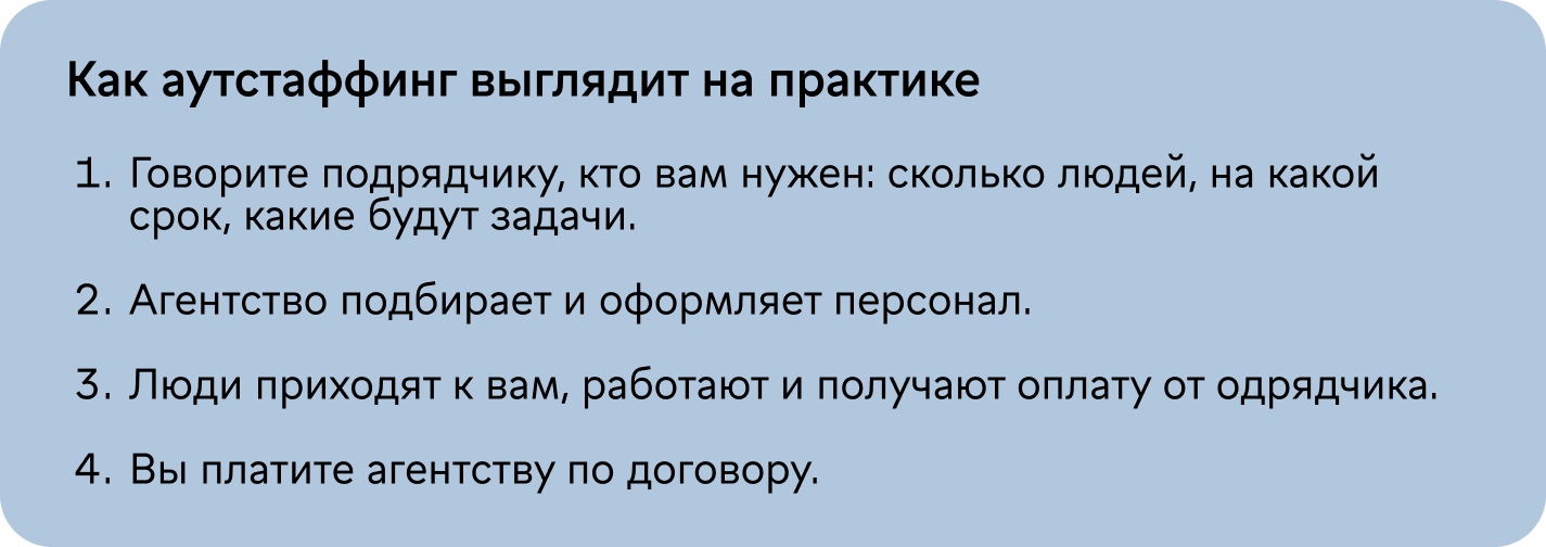 Аутстаффинг — вам предоставляют персонал, и вы сами управляете задачами, но трудовые отношения оформляет агентство.