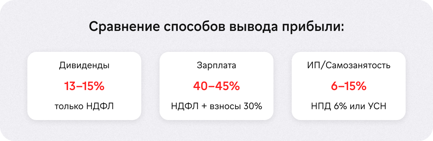 Зарплата — не инструмент для вывода прибыли, а способ получать деньги за реальную работу. Налоговая нагрузка высокая (40-45%), зато есть стабильность, соцгарантии и пенсионный стаж. Оптимально — комбинировать умеренную зарплату с дивидендами.