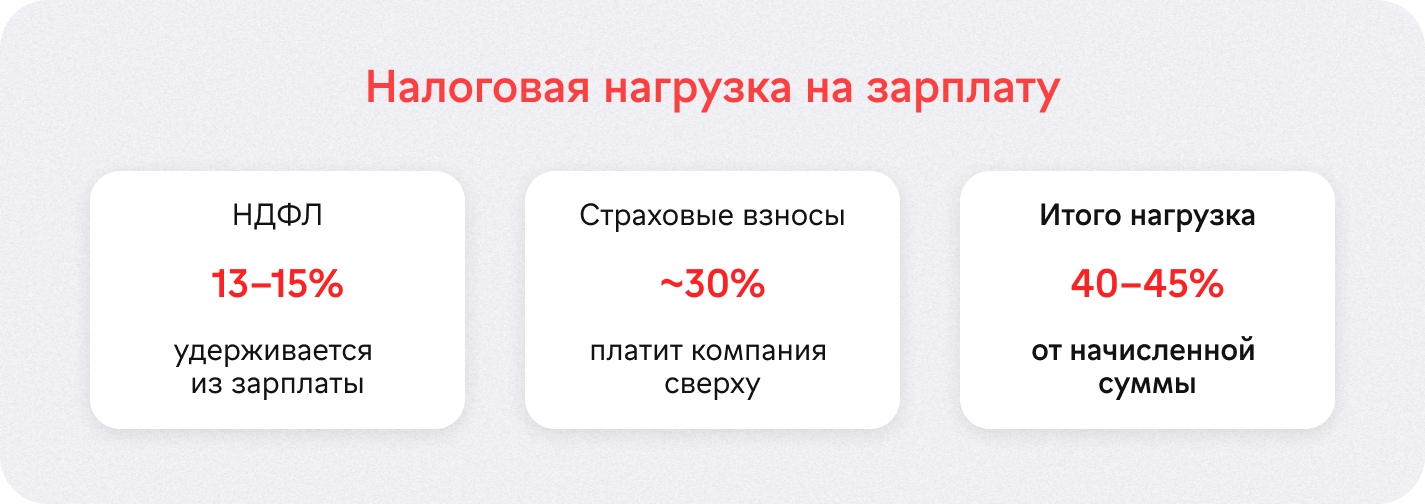 Чтобы получить на руки 100 000 рублей, компании нужно заплатить примерно 145 000 рублей (100 тыс. зарплата + 15 тыс. НДФЛ + 30 тыс. взносы).