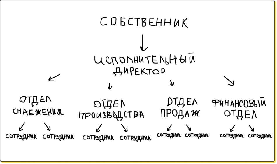 Чтобы передать процессы и рычаги управления бизнесом, их нужно описать — зафиксировать, как всё работает и кто за что отвечает. Например, набросать простую схему компании на бумаге ↓