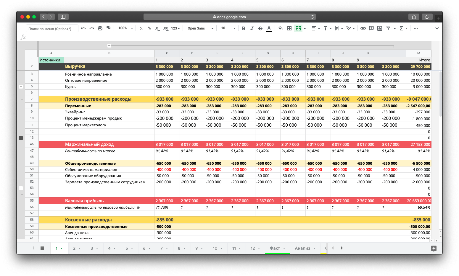 Финансовая модель. Этот отчет помогает планировать прибыль и выручку и анализировать показатели.