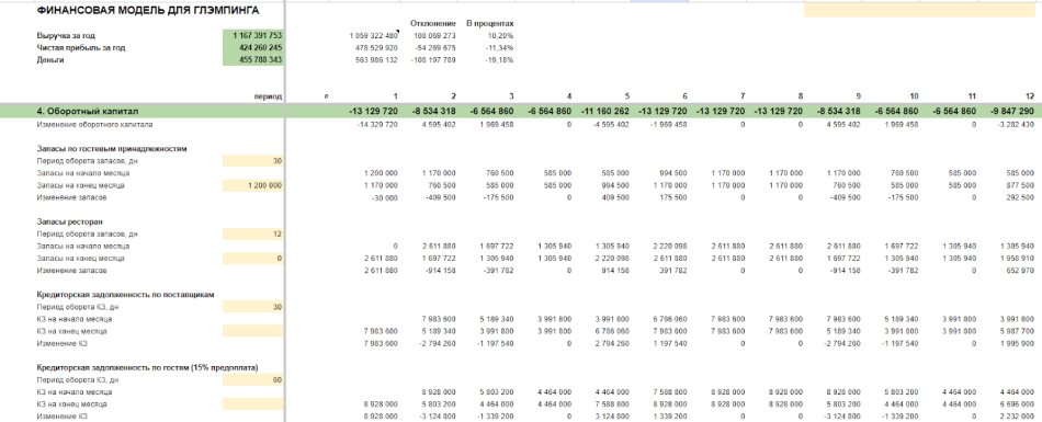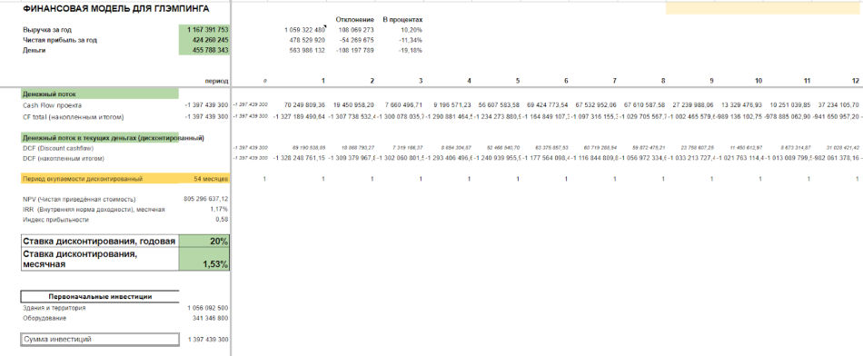 После расчета инвестиций необходимо построить финмодель функционирующего глэмпинга.