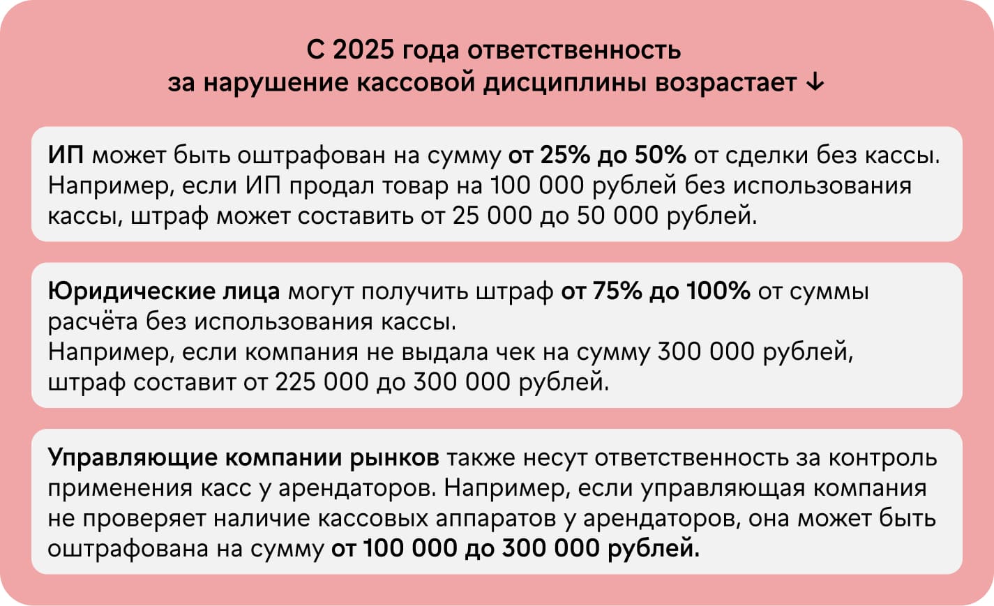 Отдельно законодательство регулирует ответственность управляющих рынками. Если администрация рынка не обеспечивает контроль за тем, чтобы продавцы применяли контрольно-кассовую технику, размер штрафа для должностных лиц может достигать 40 000–50 000 рублей, а для юридического лица — от 100 000 до 300 000 рублей.