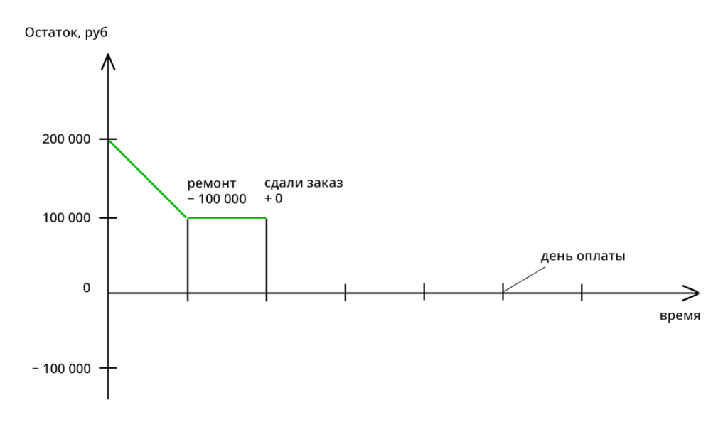 Через пару дней бухгалтер напоминает, что надо платить за обслуживание станков 100 000 ₽. Вы платите. Параллельно доделываете заказ и отправляете листовки клиенту. Начался отсчет 30 дней.