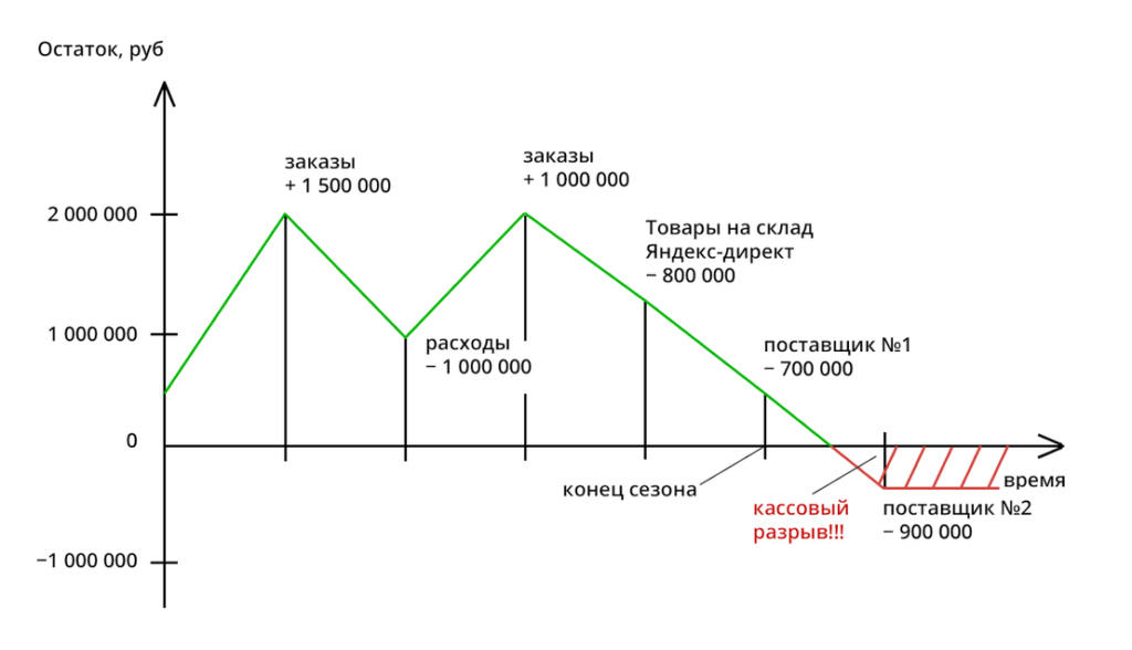Заказы продолжают идти, мы продолжаем тратить деньги и платить Яндексу больше, чем планировали. Наконец, заканчивается сезон. Приток денег падает, начинаем расплачиваться с поставщиками, и хоп, деньги кончаются.