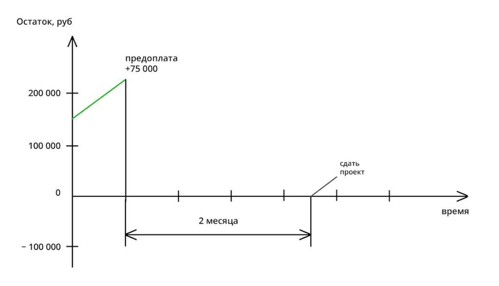 150 000 + предоплата 75 000 = 225 000 ₽. На эти деньги надо прожить до конца проекта
