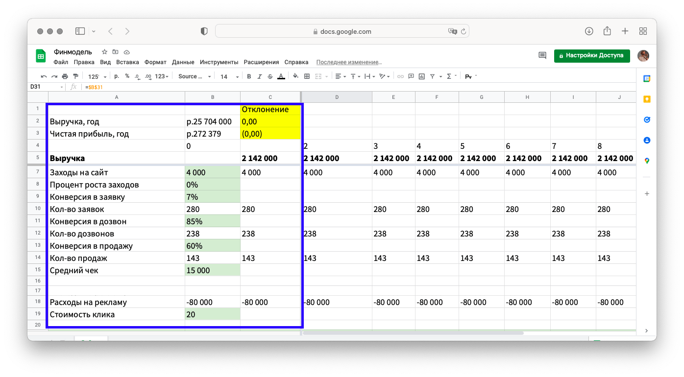Теперь посмотрим, что будет, если увеличить конверсию в заявку с 7% до 8%: