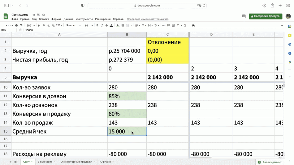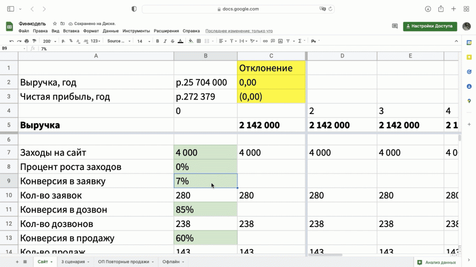 Начнем с заходов на сайт. Увеличим их с 4000 до 5000 — вполне реальная цель — и посмотрим, как изменятся выручка и прибыль: