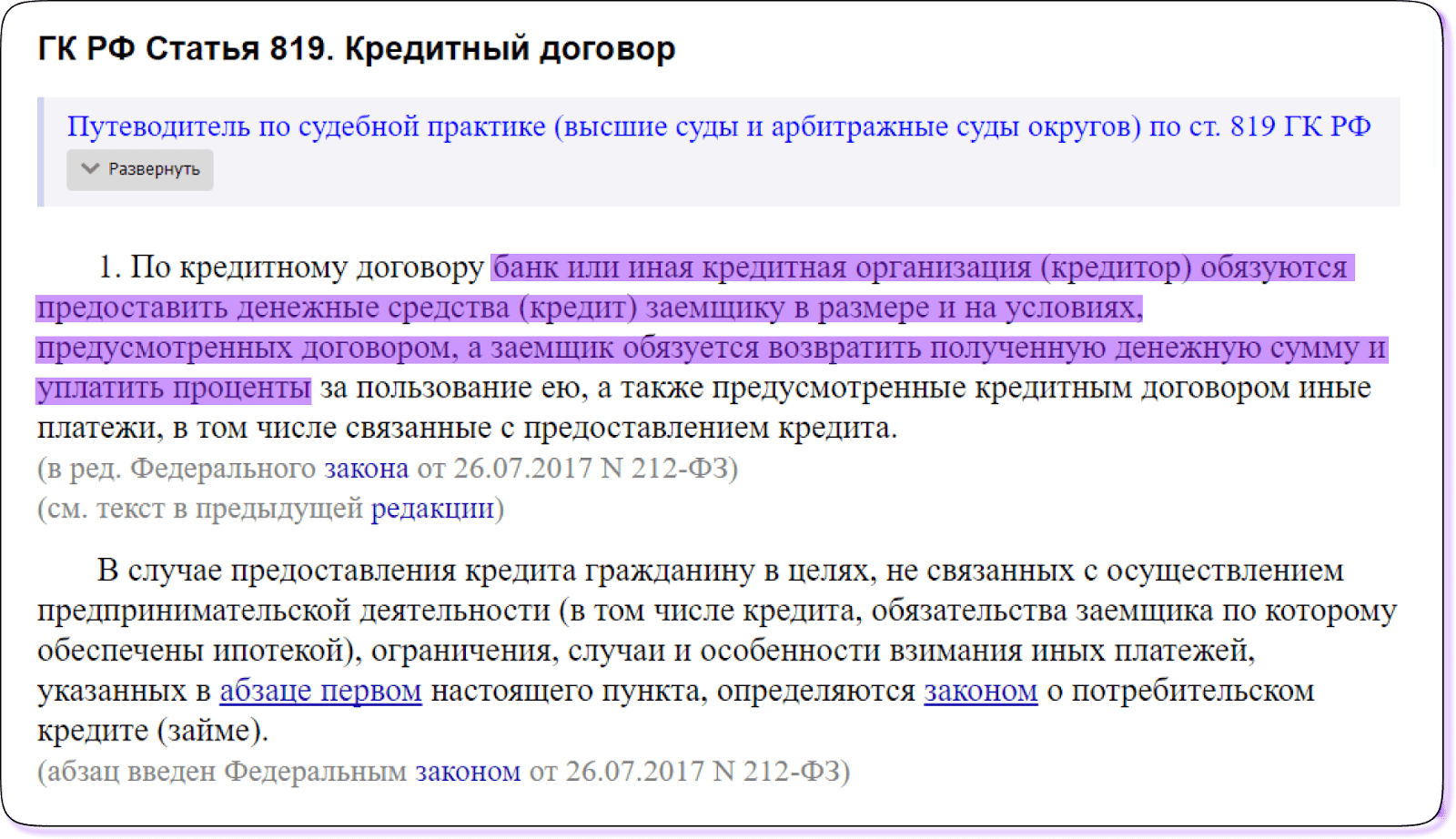 Кредитный договор описывает статья 819 Гражданского кодекса