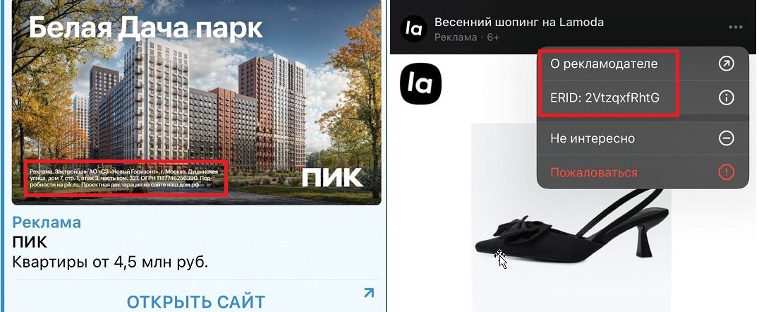 Точно так же стоит обращать внимание на саму маркировку на креативе или в тексте: если нет пометки «реклама», указания лица, размещающего рекламу, и ERID объявления в ЕРИР, маркировка считается не выполненной.