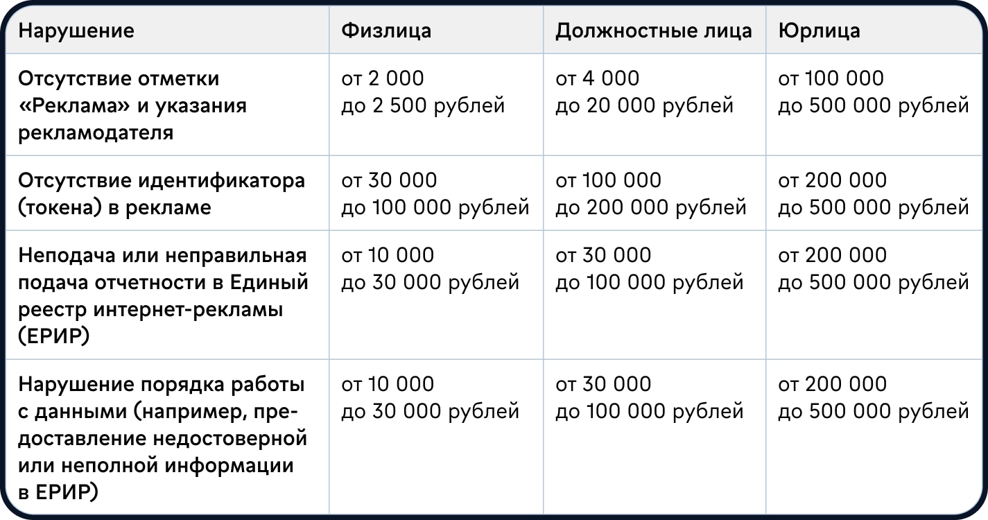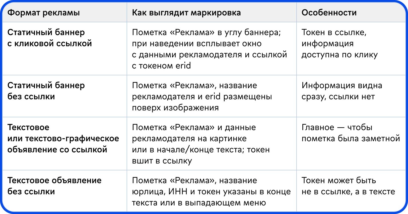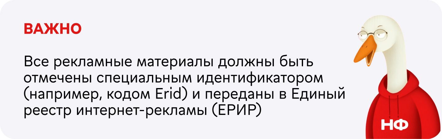 Все рекламные материалы должны быть отмечены специальным идентификатором (например, кодом Erid) и переданы в Единый реестр интернет-рекламы (ЕРИР).