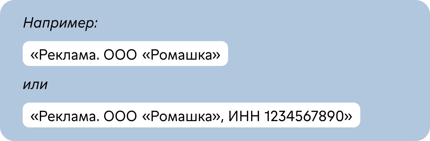 информацию о рекламодателе (название компании или ФИО ИП, ИНН)