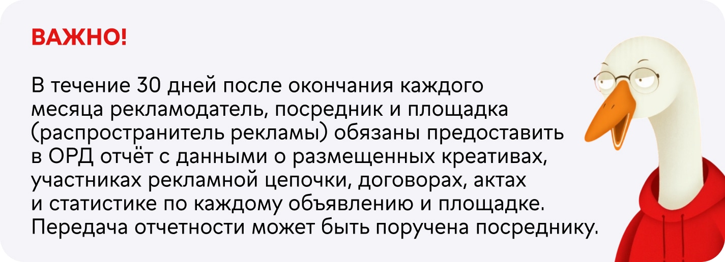 Маркировка должна быть чёткой и легко заметной для пользователей. Нужно заносить данные в ОРД без ошибок и не забывать отчитываться в течение следующего отчётного месяца по рекламе за предыдущий. Без отчётности данные не актуальны, и маркировка считается не выполненной.