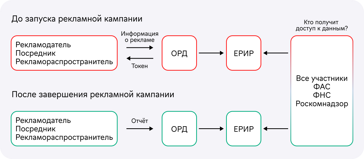 Рекламодатель или посредник выбирает подходящего оператора рекламных данных (ОРД), с которым заключает договор. ОРД — это посредник, который присваивает каждому рекламному креативу уникальный идентификатор (токен) и передает сведения в Единый реестр интернет-рекламы (ЕРИР).
