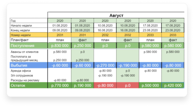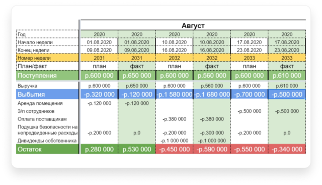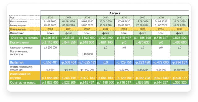 От кассовых разрывов помогает платежный календарь — мы называем его «мазью от кассовых разрывов». Это простейший финансовый инструмент, который помогает компаниям следить за денежным потоком и вовремя реагировать на форс-мажоры.