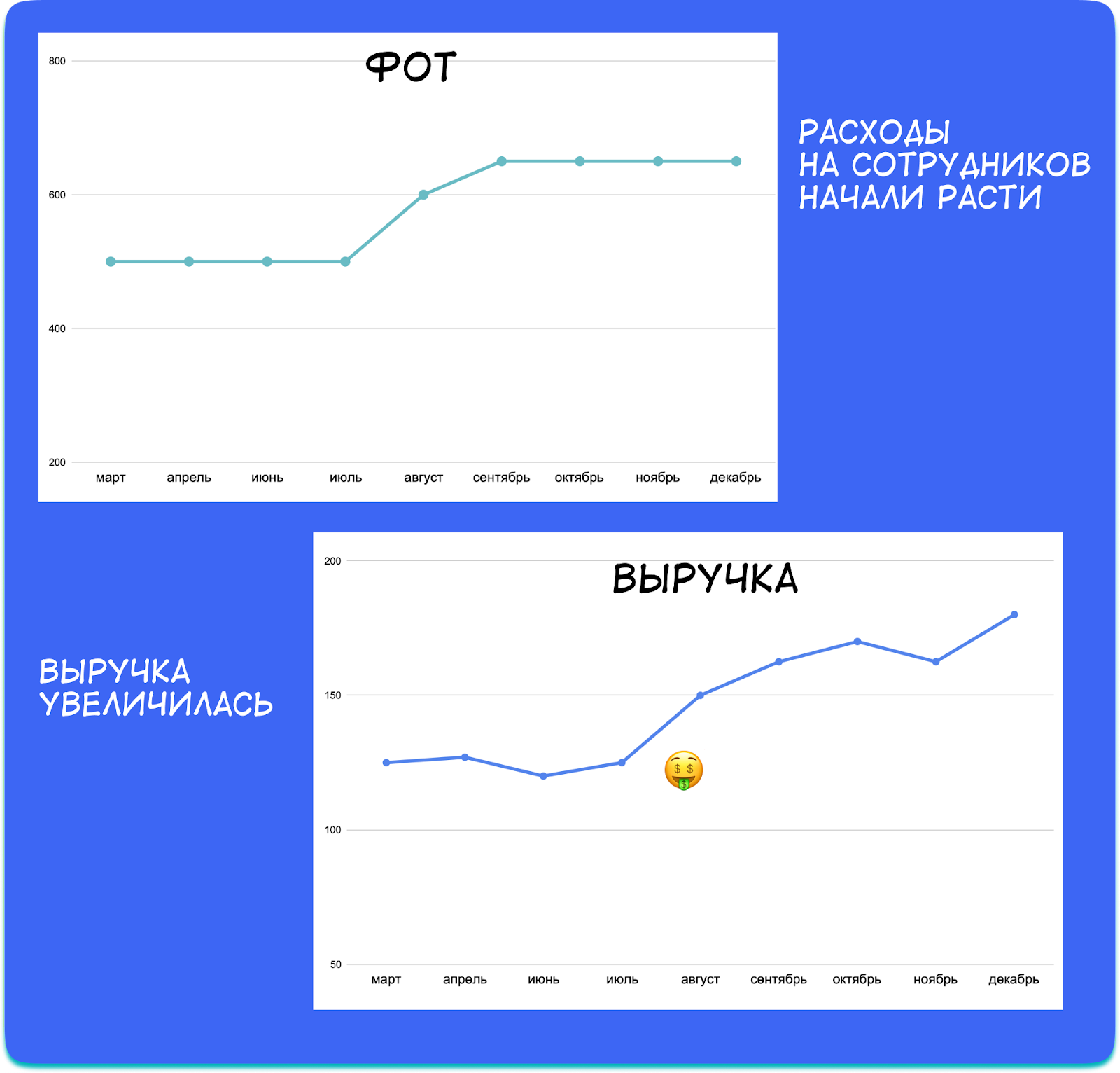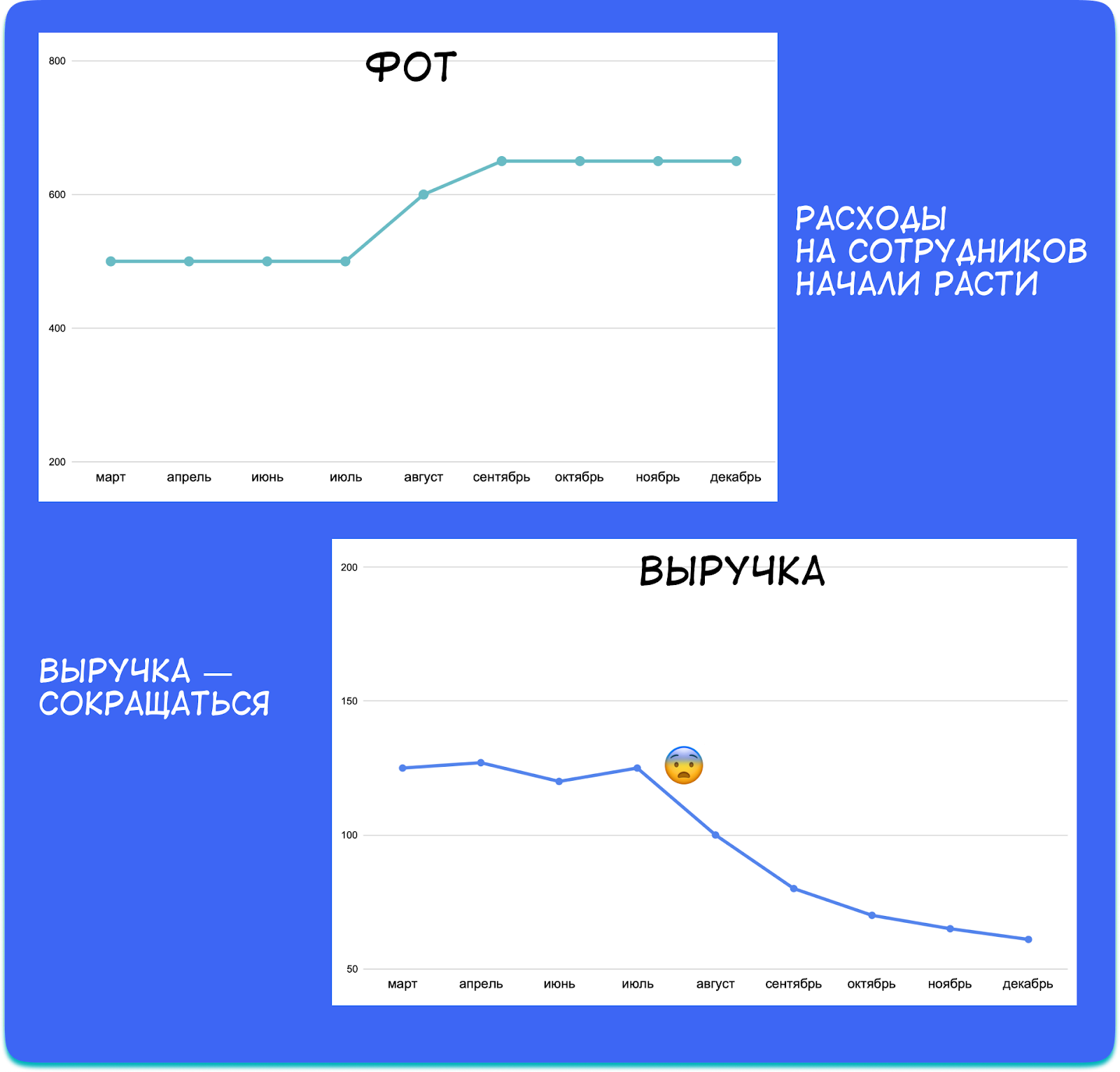 Сравним две ситуации. В первой ФОТ вырос, а вот выручка начала снижаться. Значит, что-то не так в системе мотивации, — нужно ее пересматривать ↓