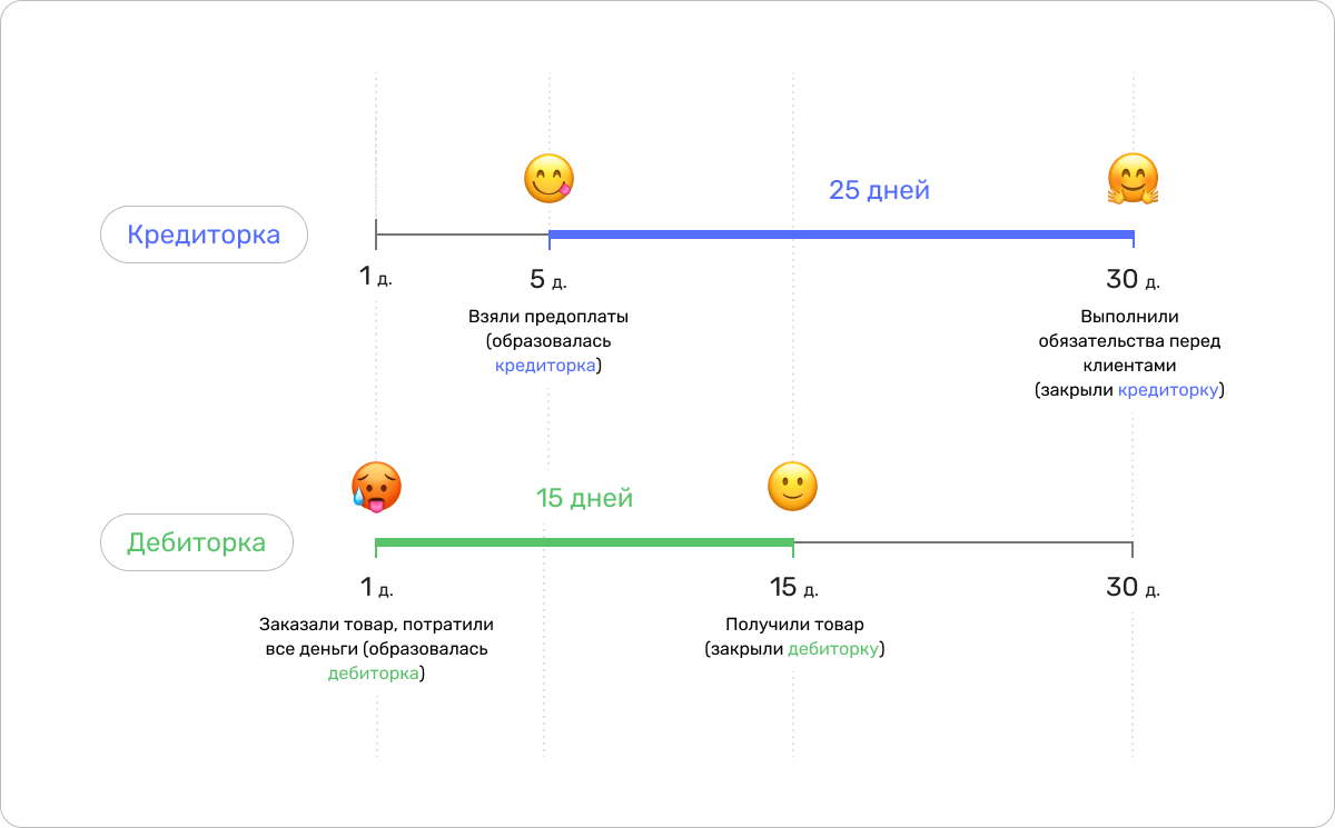 У дебиторской и кредиторской задолженностей есть периоды оборачиваемости. Например, «период оборачиваемости дебиторки 7 дней» значит, что ваш должник платит вам в течение 7 дней. Магия в том, что при определенном балансе дебиторки и кредиторки у вас с деньгами будет все хорошо.