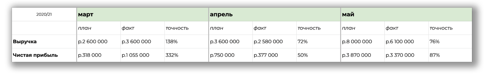 Сначала планировали как попало. Мы планировали получить прибыль в 300 тысяч, а получили 1 млн рублей — здорово, но неточно. Потом запланировали больше — 750 тысяч, а получили 377 тысяч рублей — плохо и неточно. Так мы калибровались несколько месяцев, и каждый раз план становился немного точнее: