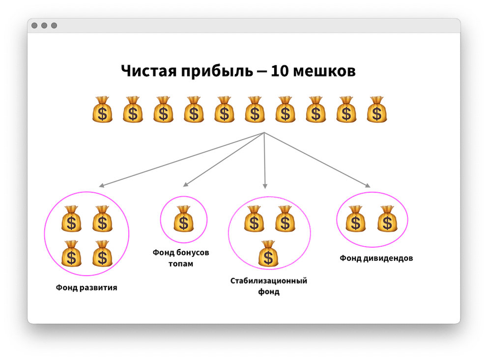 Когда мы начали разрабатывать план, столкнулись с тем, что деньги на развитие смешивались с деньгами на зарплату, аренду и все остальное. Это было рискованно: можно случайно потратить больше или не из той кучки. Поэтому я ввела систему фондов. Фонды — это отдельные счета, по которым компания распределила чистую прибыль.