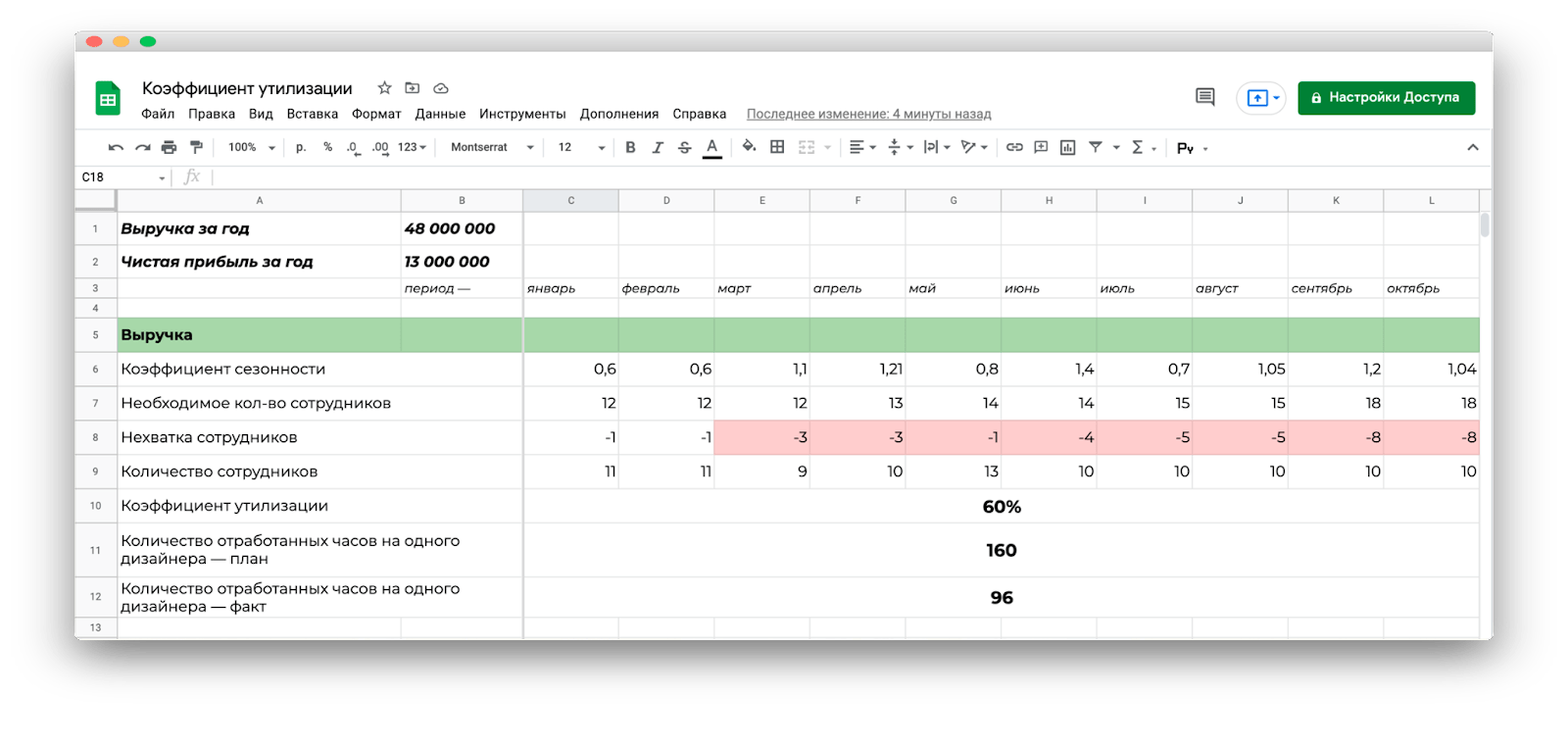 Чтобы проверить загрузку сотрудников, я рассчитала в финмодели коэффициент утилизации — он показывает, насколько эффективно работают сотрудники. Например, у программиста восьмичасовой рабочий день, но очевидно, что он не пишет код все это время. Он ходит пить кофе с печеньками, болтает с коллегами и между делом отвечает на грустные сообщения продакт-менеджера. То есть на работу он тратит около пяти часов, и его коэффициент утилизации — 60%.